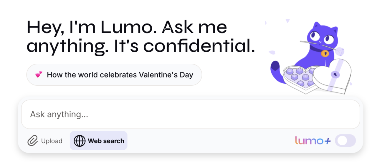 Lumo は Proton の AI。紫色の猫が色々と答えてくれる。