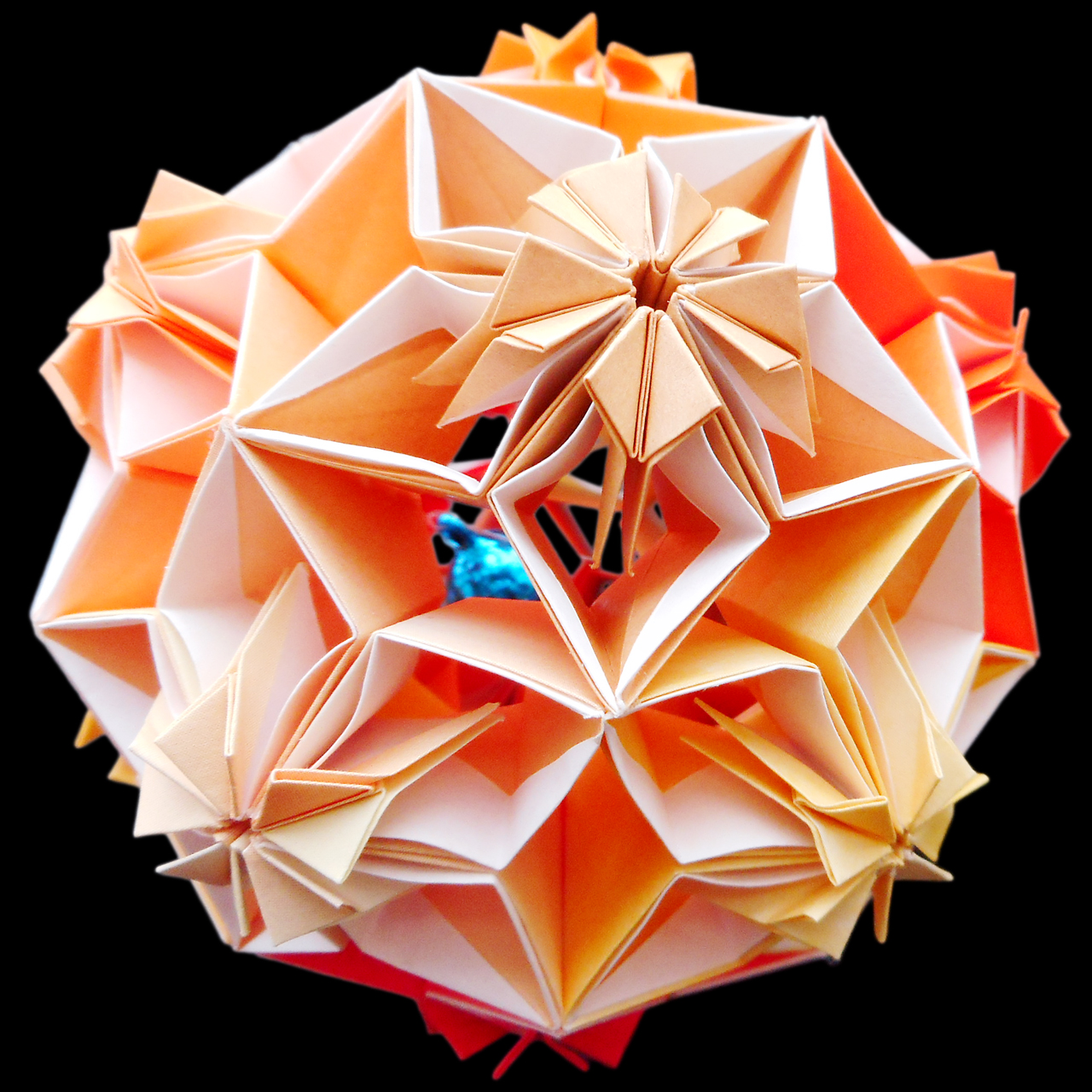 The inside of the kusudama is hollow, allowing for various uses such as placing a bell or potpourri inside. The sample piece includes a bell.