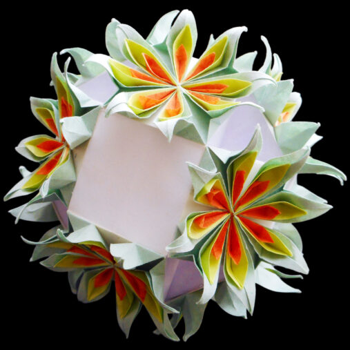 Chrysanthemum "Rocca" / ロカ菊MEMOThe Origami zaiku Series consists of decorative parts for embellishing 1/4-unit squares, and adhesive is used to decorate. The Rocca chrysanthemum has petals the same size as the Rossano chrysanthemum and look